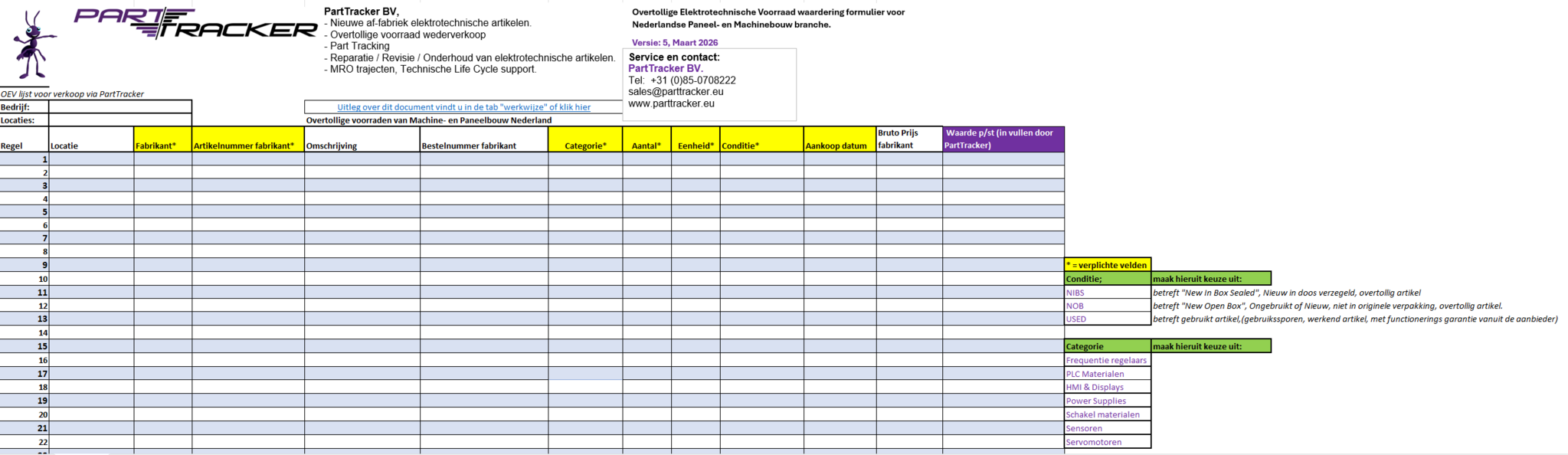 Der Verkauf von elektrischen Teilen über PartTracker wird durch das Ausfüllen unserer vorbereiteten Excel-Vorlage ermöglicht. Unten werden wir Ihnen genau sagen, was Sie tun müssen, um mit dem Verkauf zu beginnen. Nachdem wir die Excel-Datei überprüft haben, werden wir uns kurz bei Ihnen melden, um den Verkaufsprozess zu erklären. Hier werden wir Antworten auf alle Ihre möglichen Fragen geben.