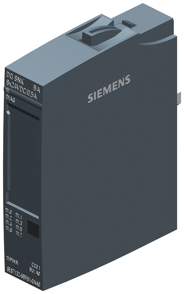 SIMATIC ET 200SP, Digital output module, DQ 8x 24V DC/0,5A Sink Basic, Sink output (NPN, M-switching), Packing unit: 1 piece, fits to BU-type A0, Colour Code CC01, substitute value output, module diagnostics for: supply voltage